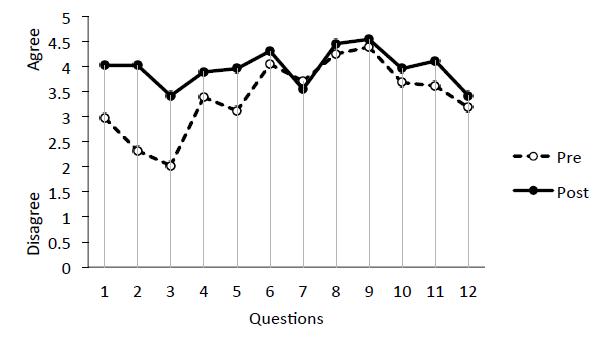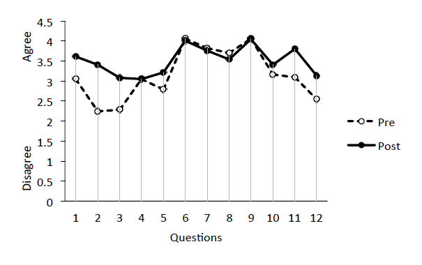 Responses averaged across students for each of the 12 survey questions (see above for specific questions). The data presented here represents two courses with 46 students taking the pre-semester and 44 students taking the post-semester survey.
